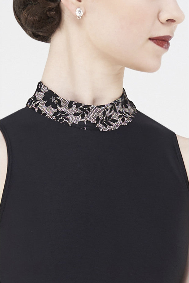 Two-material leotard with wide-cut armholes and a high collar with a drop-shaped opening in the back closed by two buttons.
